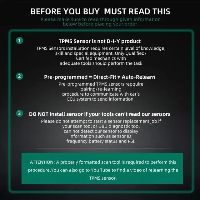Advise your installer to scan tpms sensors to make sure their tool can retrieve sensor information such as frequency,tire pressure ,battery status and etc before install sensors on your car. Avoid unnecessary installation fees.