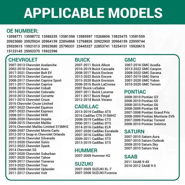 Please double check the compatibility, the OE and Frequency of your original sensor to see if it matches our products.You can also check your vehicle's fitment by using" 's confirmed fit fuction"or ask us