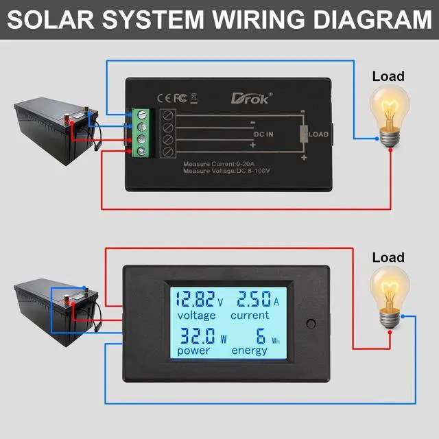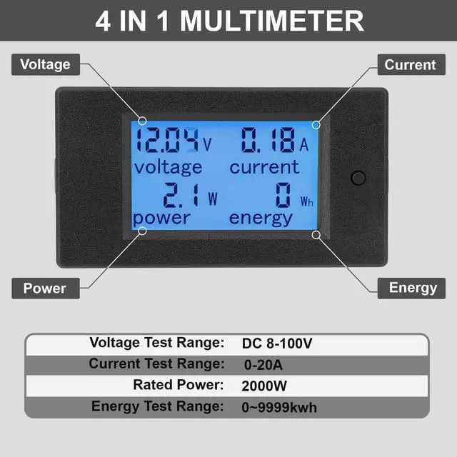 • Voltage test range: DC 8~100V; Current test range: 0~20A; Power test range: 0~2KW; Energy test range: 0~9999kWh.