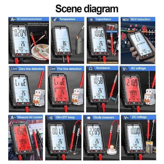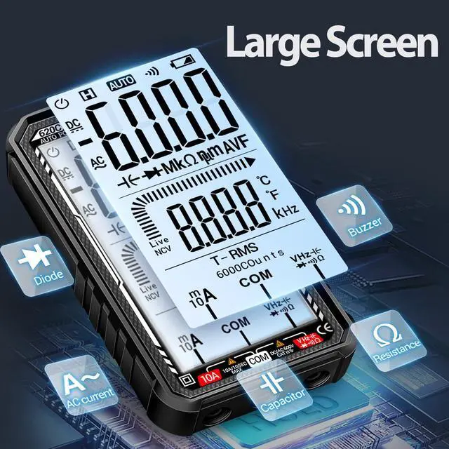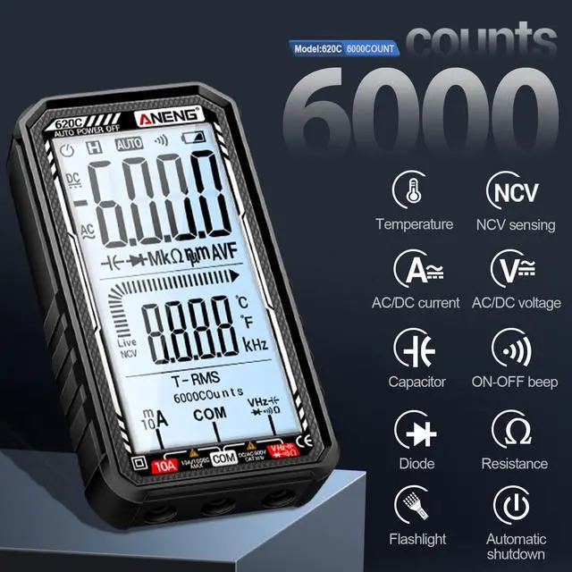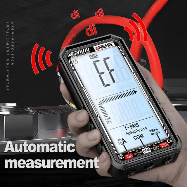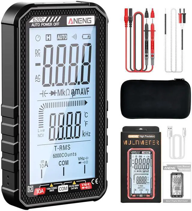 Accurately measure AC/DC voltage, current, resistance, capacitance, and more with this smart multimeter. Featuring auto-ranging, a large LCD display, and built-in flashlight for clear readings in any environment. Rechargeable and portable for convenient use.