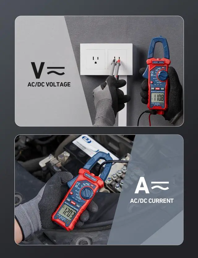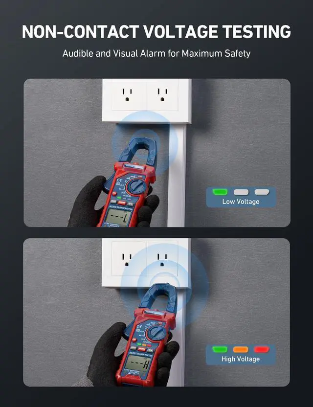 Use the clamps to perform non-contact voltage tests; an audible and visual alarm indicates voltage.