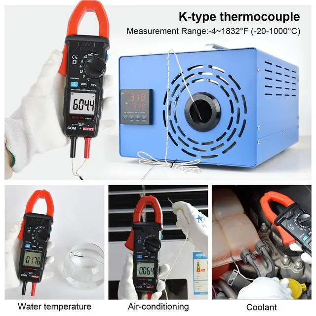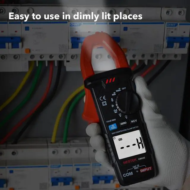 The MESTEK CM83E Digital Clamp Meter with True-RMS 6000 counts, AC/DC Current meter. it has the functions of data hold, ZERO function, automatic range, temperature measurement, automatic shutdown, backlight, flashlight, full-range overload protection and battery under-voltage indication, batterres included. You can use it to measure Current, Voltage, Temperature, Continuity, Diode, Capacitance, Frequency, Resistance and Continuity of circuits, switches, fuses and contacts