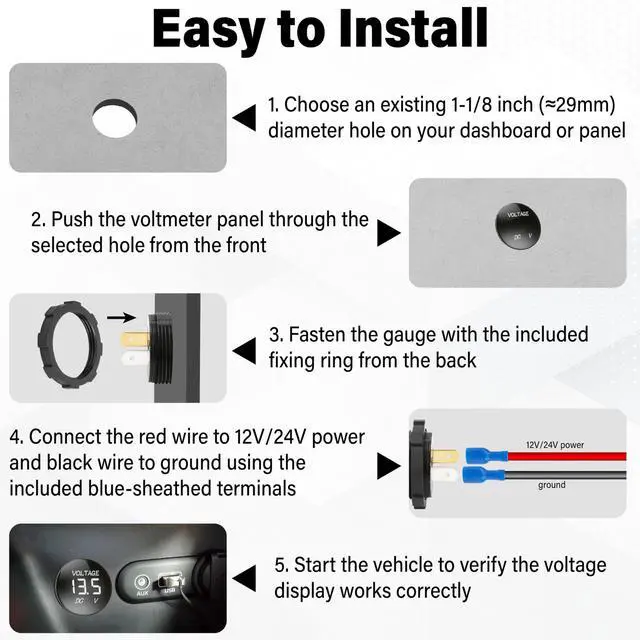 Yes, the DC voltmeter is simple to use: just connect the two blue-jacketed terminals to your vehicle's power source, insert the panel into the opening, and secure it with the threaded retaining ring. Once properly connected, it works immediately.