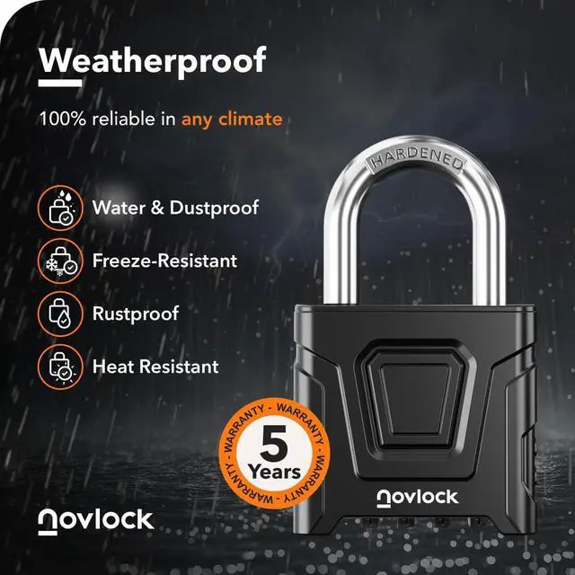 Heavy-Duty Outdoor Combination PadlockBuilt with durable, high-quality materials to withstand rain, heat, freezing temperatures, dust, rust, and corrosion. Designed for year-round outdoor use, this weatherproof padlock passed a 180-hour salt spray test and protects your belongings in all conditions.