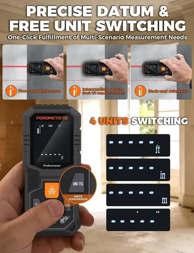 SMART FEATURES FOR EFFICIENCY: This laser measure keeps you movingstore up to 30 readings for quick review, so you never lose a number. Three measurement datums (front, intermediate, back) let you choose the right reference for any job. Need totals? The add/subtract functions make it easy. And with units that switch between M, ft, in and ftin at a tap, you're always in control. No more scribbled notes or mental math, just smart, effortless measuring.