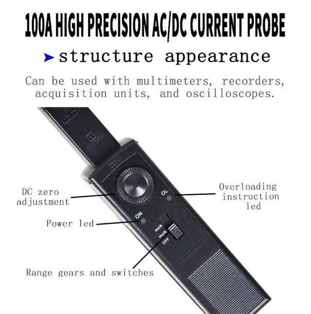 • The DC/AC current probe meter is small and delicate, easy to carry, can be widely used in motor drive, power frequency, inverter, power supply and avionics.