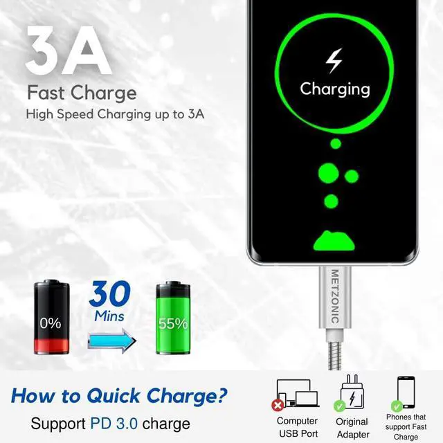 - High-quality copper wires maximize durability and charging signal. Fast charge your phone up to 3A. Data transfer speed up to 480Mb/s.