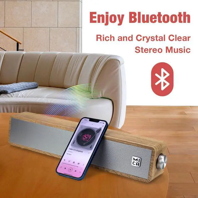 Crafted with an MDF wooden casing, our soundbar delivers warm, authentic audio. Dual 5W speakers ensure crystal-clear sound, bringing your music, movies, games to life with enhanced depth and clarity.