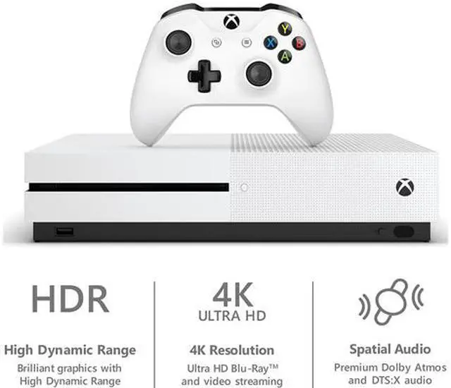 Own the Xbox One S 1TB Console and get access to over 2,200 games that you can only play on Xbox One. This bundle includes a 1-Month Xbox Game Pass Ultimate trial. Play with friends near and far and enjoy the highest quality 4K including built-in 4K Ultra HD Blu-ray and 4K video streaming. Xbox Play Anywhere games let you play at a friend's house and then pick up where you left off on any Xbox One or Windows 10 PC. Plus, enjoy 100 additional games right out of the box with a 1-Month Xbox Game Pass Ultimate trial. Xbox One S delivers brilliant graphics with HDR technology, premium audio, and fast, reliable online gaming with friends. Access all your favorite entertainment through apps like YouTube, Netflix, and more. Whether you're playing with instant access to over 100 games on Xbox Game Pass, watching 4K movies, or streaming live gameplay, there's never been a better time to game with Xbox One.