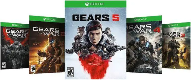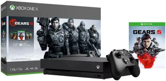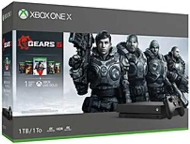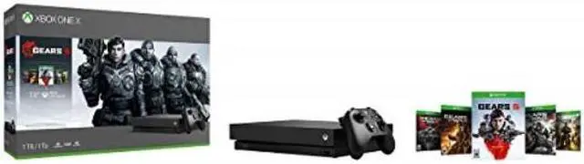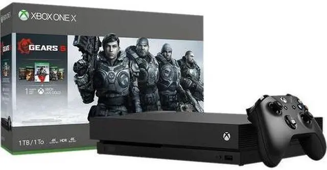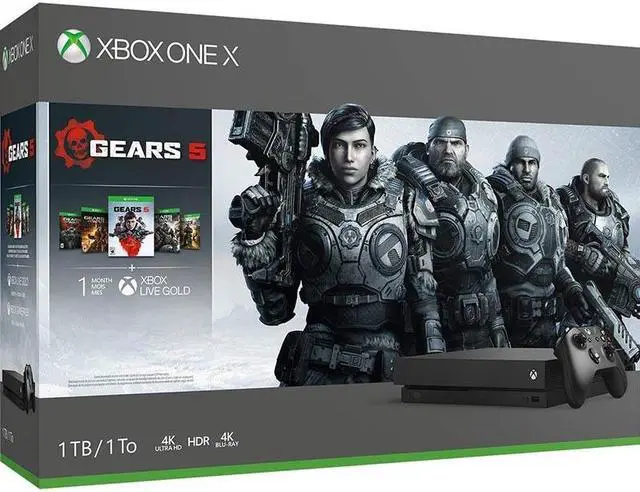 Own the Xbox One X Gears 5 Bundle and experience an epic campaign and brutal action across 5 thrilling modes. This bundle includes an Xbox One X; a full-game download of Gears 5; a full-game download of Gears of War Ultimate Edition; full-game downloads of Gears of War 2, 3, and 4; a 1-month trial of Xbox Game Pass; 1 month of Xbox Live Gold; and an Xbox Wireless Controller. Online multiplayer requires Xbox Live Gold membership (sold separately).