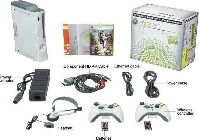 | Feature | Full Microsoft Warranty Two Wireless Controllers 20GB Hard Drive Shadowrun game FREE Wired Headset Ethernet Cable |