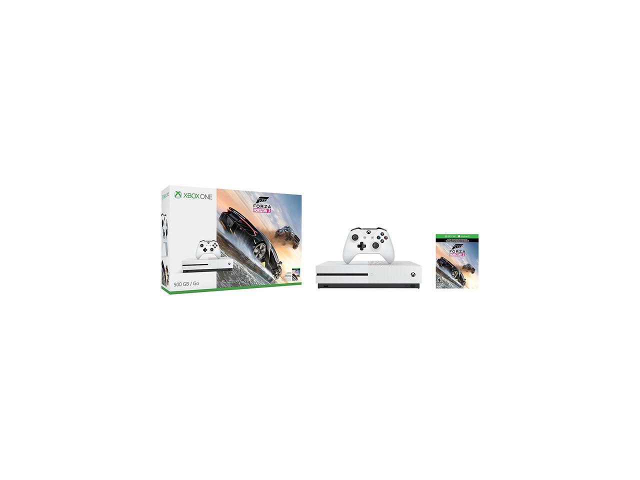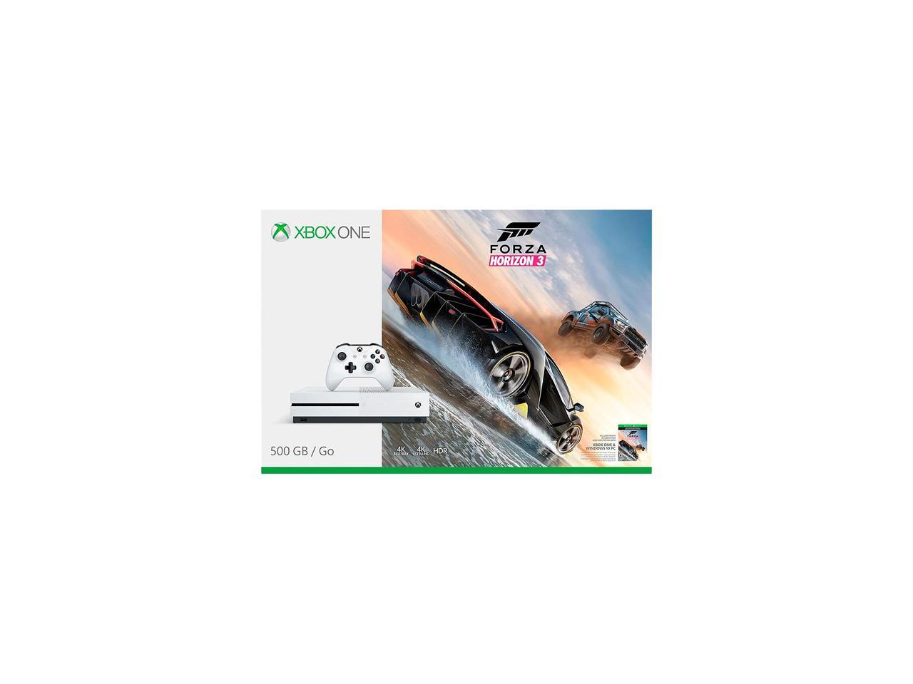 • Includes: Xbox One S 500GB Console, full game download of Forza Horizon 3 for Xbox One and Windows 10, Xbox Wireless Controller, HDMI cable (4K Capable), AC Power cable, 14-day Xbox Live Gold Trial