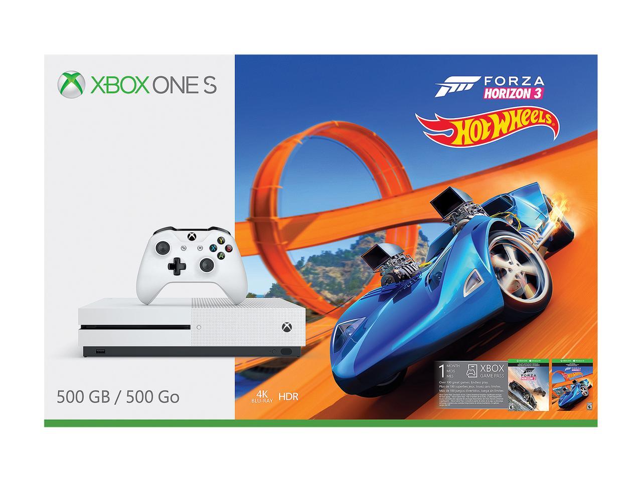- Bundle includes: Xbox One S 500GB console, Xbox wireless controller, Forza Horizon 3 game download, Hot Wheels expansion download, HDMI cable (4K capable), 14-days Xbox Live Gold Trial and 1-month Xbox Game Pass
