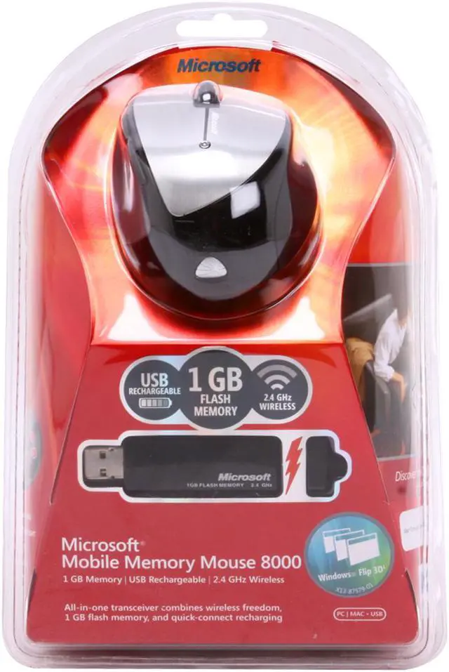 | Features | Transceiver with 1 GB Flash Memory The transceiver is also a fully functional flash drive, so you can store and transfer files and free up USB ports. 2.4 GHz Wireless Technology The 2.4 GHz wireless USB mini-transceiver connects wirelessly right out of the box with virtually no interference, and up to 30 feet of wireless range. USB Rechargeable with Magnetic Connectors Simply snap in the magnetic connectors to charge while working, using the included USB transceiver. High Definition Laser Technology Microsoft High Definition Laser Mouse products are more precise, more responsive, and deliver smoother tracking. Battery Life Indicator You won't get caught with a dead battery--the Battery Status LED Indicator glows red when the battery is running low. Magnifier Point and click to enlarge and edit detail using the Magnifier. 4-Way Scrolling Scroll four ways for greater efficiency and comfort with Tilt Wheel Technology. 5-Button Mouse Get quick access to the media, programs, and files you use most often with customizable buttons. Flip 3D Easily flip through all open windows with Flip 3D. Instant Viewer Too many open items on your desktop, Click the scroll wheel button to instantly display your open windows, then point and click to select. Right Handed Design Mouse design is optmized for right handed users. Scroll Wheel Save time and effort with the scroll wheel--navigate documents and Web pages without using the on-screen scroll bar. On/Off Button Turn your 3-in-1 device off to extend battery life even longer. Bluetooth Mode Switch A switch on the bottom of the mouse enables Bluetooth notebook users to connect directly to their PC without using the included transceiver. Carrying Case Protect your mouse while you're on the go. Designed for Notebook PCs Compact and comfortable, our handy notebook and laptop products are designed for convenience and mobility. |