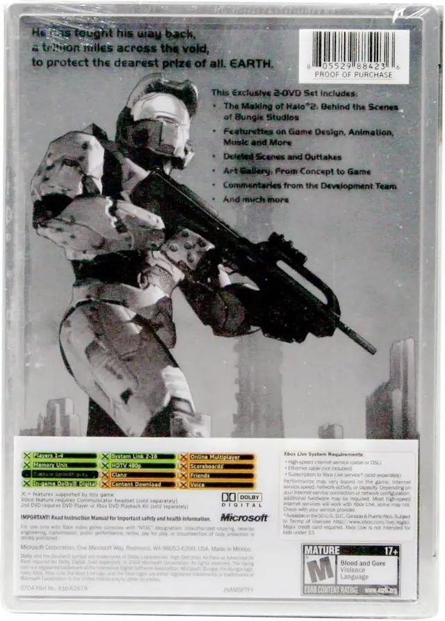 | Features | The epic battle comes to Earth. In Halo 2, genetically enhanced super soldier Master Chief is humankinds final protector against the relentless alien Covenant. Take command and take your gameplay to the next level. This limited edition comes in a special tin box and includes commentaries, a "making of" feature, art galleries and more. |