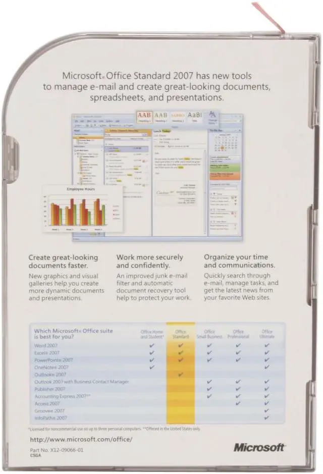 Microsoft Office Standard 2007 offers the core Microsoft Office applications, but significantly updated for faster, better results. Comprised of Excel, Word, PowerPoint, and Outlook, this software suite empowers you to create high-quality documents and presentations, build powerful spreadsheets, and manage your e-mail messages, calendar, and contacts. With improved menus and tools, enhanced graphics and formatting capabilities, new time and communication management tools, and more reliability and security, Office Standard 2007 makes it easier and more enjoyable for you to get things done at home or work.