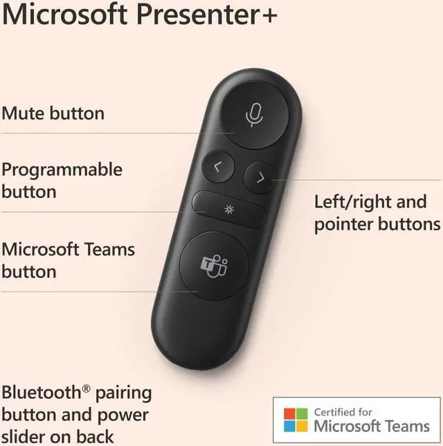 No more ‘you are on mute’: Integrated mute control with status light ensures you don’t get caught talking to yourself. Join the conversation: Quickly join a meeting and raise your hand with the integrated Microsoft Teams button. Reliable control, at your desk or across the room: Present from almost anywhere, with a wireless range up to 32 feet/ 10 meters, and up to 6 days of battery.1 Compatibility and control: Works with popular presentation and meeting apps.1 Certified for Microsoft Teams, with integrated controls. Customize your experience: Programmable button enhances presentations and day-to-day meetings. Helpful cues you can feel: Get reliable control during meetings, such as a reassuring vibration when you go on and off mute, or raise and lower your hand.