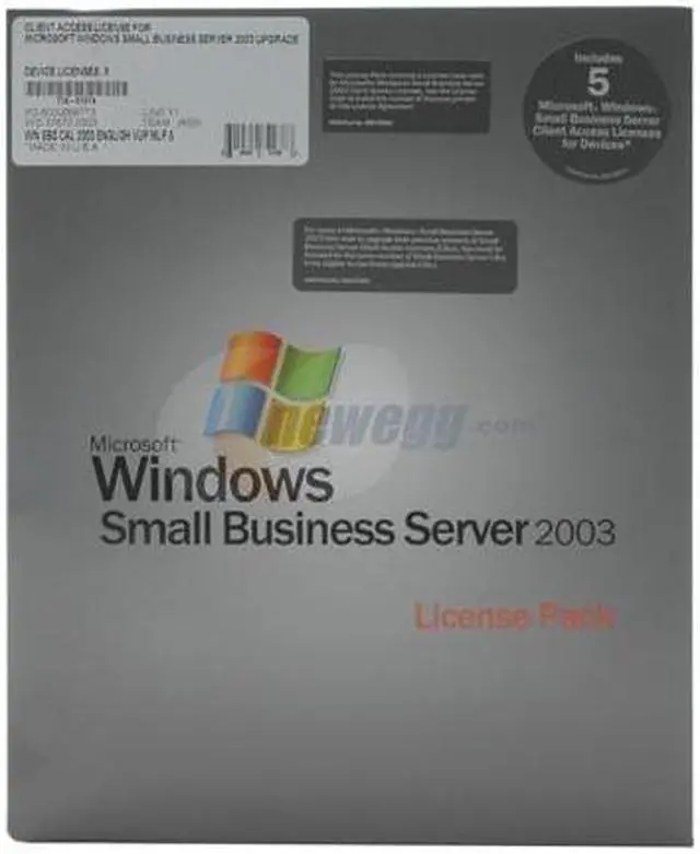 | Feature | Windows Small Business Server 2003 Upgrade License 5 Device CALs Windows Small Business Server 2003 is a complete, affordable network solution designed for businesses with 5 Device. As your business grows and your needs change, you can protect your technology investment with the Windows Small Business Server 2003 Transition Pack and move seamlessly into the full line of Windows Server products. This pack comes without media. |