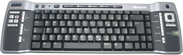 | Features | Backlit Media Keys Turns the lights down low without having to squint and peck to control your Media Center. Green Start Button Launch Media Center PC functions with the press of a single green start button. Sleek, All-in-One Design Enjoy all of your digital media clutter-free with this 3-in-1 keyboard with integrated mouse and remote control. 30-Foot Wireless Range Effortlessly control all kinds of digital entertainment from across your living room with thirty-foot wireless range. Key Lock The Key Lock keeps this sleek, stylish keyboard from being turned on by mistake, so you can stow it without worry. Windows XP Media Center Edition 2005 Easily control your computer and home entertainment center—including music, movies, and photos—from the comfort of your couch. |
