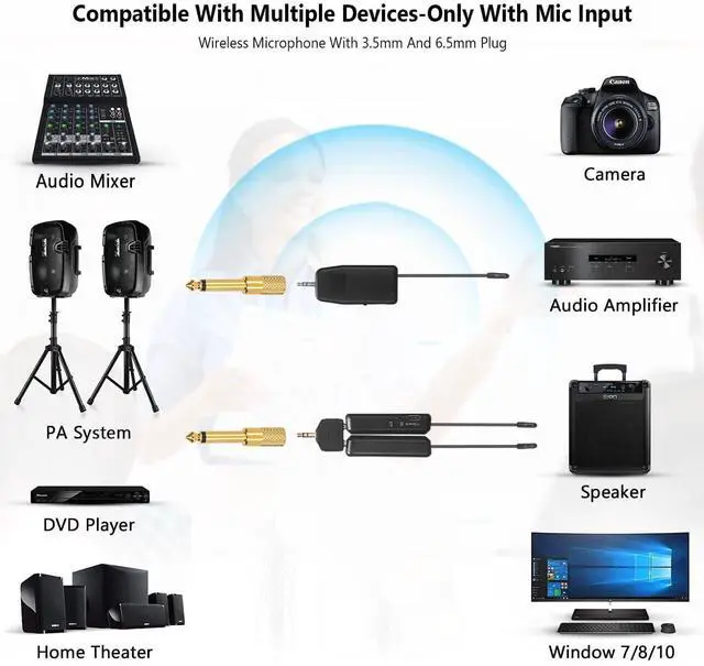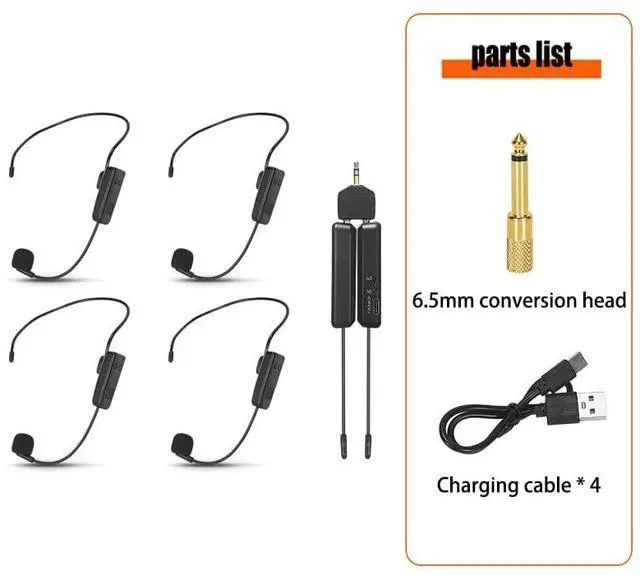 2 Receivers and 4 Transmitters for 4 PeopleThe wireless microphone system can be used by four people at the same time.Freely match the headset you want ,of course ,you can also use only one microphone .The working method is to pair four transmitters with two receivers ,and two receivers are connected with a U-shape interface.So your device only needs to have a microphone jack to complete the work of four people.
