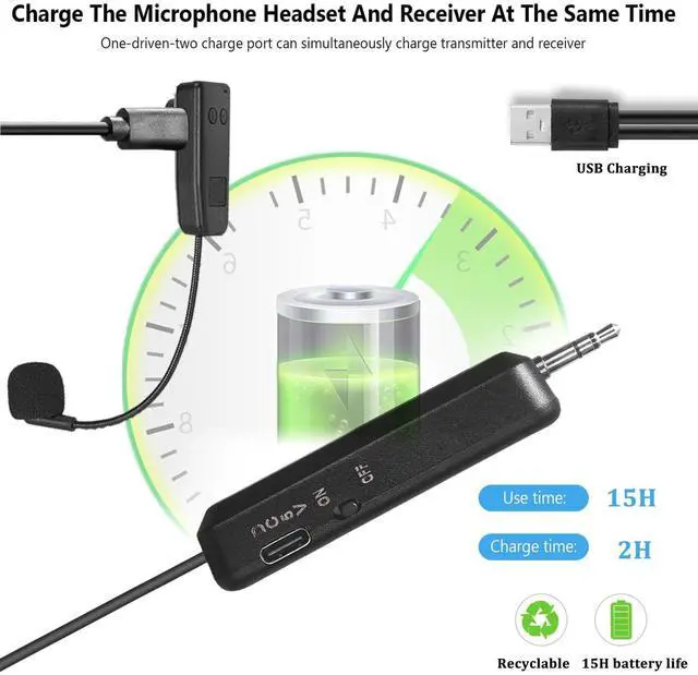 Rechargeble Microphone and receiverThe microphone and receiver are both built-in 1200mAh rechargeable lithium-ion battery. work time up to 7 plus hours with charging time 3-4 hours.The charging cable are included in package,support charging the dual microphones and receiver in one cable at the same time.