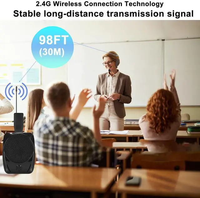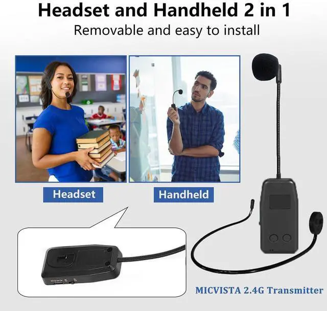 2.4G Wireless TransmitterAdopted adavanced 2.4G wireless transmission technology.The wireless headset microphone system is easy to pair,just turn on the transmitter and receiver power switchers,the blue light will flash for appoximately 2s,indicator light stops flashing after succesful match ,and then you can use the wireless headset microphone for vouce amplification ,no further action.