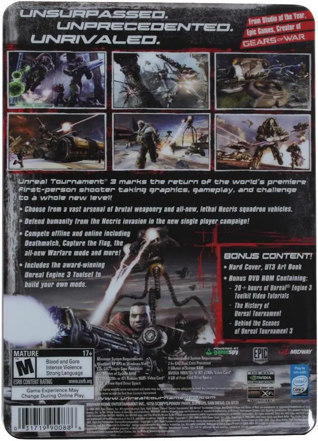 | Features | Unreal Tournament 3: Collector's Edition unleashes the full power of Unreal Engine 3, taking graphics, gameplay, and challenge to a whole new level. Players engage in intense battles with other human players online, or against Unreal artificial intelligence that sets the industry standard. |