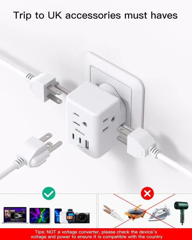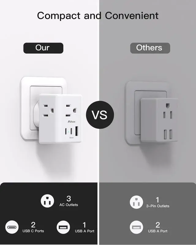 3-in-1 input outlets are compatible with standard North American 2 and 3 prong flat pin plugs. 3 side design with larger space will not block other adapters, that is easier to use for all kinds of equipment.