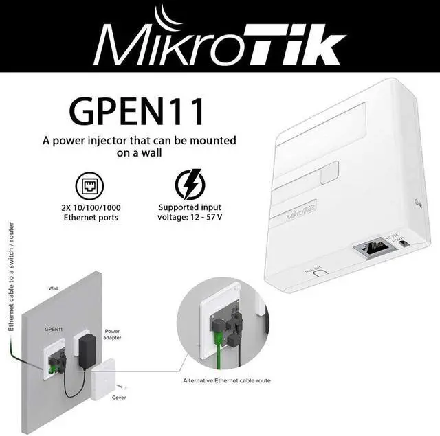 The GPEN11 is a power injector that can be mounted on a wall, and will power your uplink devices with PoE power. The GPEN11 is part of the GPEN (Gigabit Passive Ethernet Network) concept, which aims to replace GPON installations with lower cost and more easy to deploy ethernet alternative.? It also has a designated space for an ISP sticker on the front.
