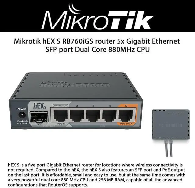 - Mikrotik hEX S (RB760iGS) is a five port Gigabit Ethernet router for locations where wireless connectivity is not required.
