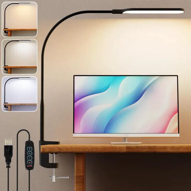 LED Desk Lamp with Clamp, 3 Color Modes 10 Brightness Levels, Long Flexible Gooseneck, Ultra Wide Brightness Range, led Clip Desk lamp, USB Eye-Caring Clip on Lights for Home Office, Black