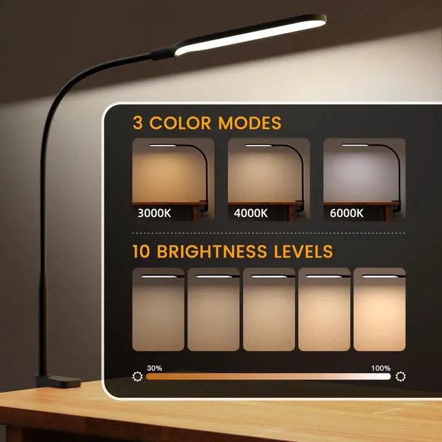 3 Color Modes & 10 Brightness LevelsThis LED desk lamp is equipped with 3 color temperatures (3000K Warm White, 4500K Natural White, 6000K Cool White) and 10 dimmable brightness levels. Easily find your ideal setting: use warm light for relaxing, natural light for detailed crafts like sewing, or cool white for maximum focus. Achieve your ideal ambiance in seconds.