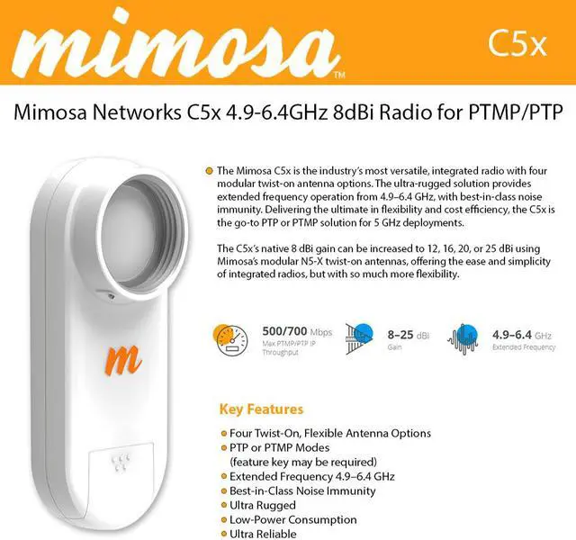 The Mimosa C5x is the industry’s most versatile, modular, radio solution with five gain options (8, 12, 16, 20 and 25 dBi). The ultra rugged solution provides extended frequency operation from 4.9–6.4 GHz, with best-in-class noise immunity. Delivering the ultimate in flexibility and value, the C5x is the go-to solution for 5 GHz deployments. Out of the box, the C5x can be used in PTMP mode, with Ethernet link speeds of up to 100 Mbps. With the purchase of a PTMP speed feature key, speeds of up to 500 Mbps will be unlocked in PTMP mode. In order to unlock and utilize PTP mode, with speeds of up to 700 Mbps, a PTP feature key must be purchased.