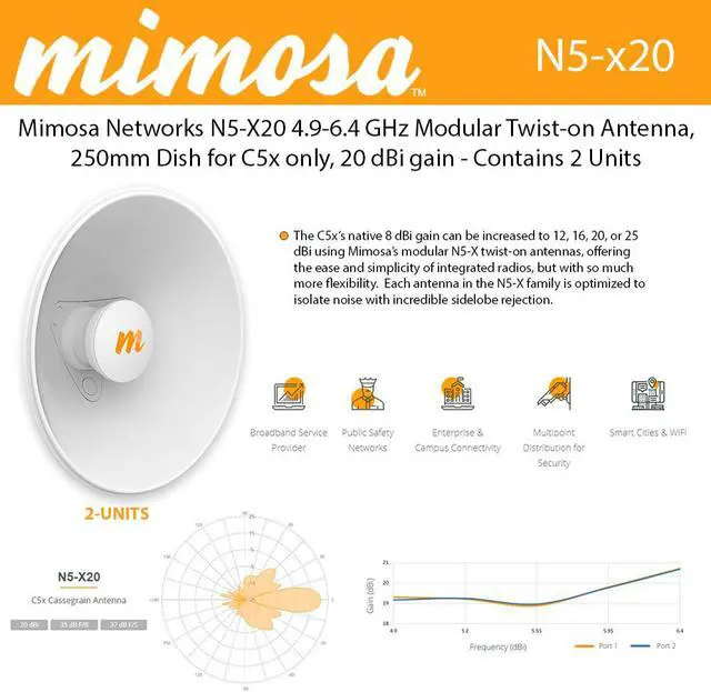 The C5x’s native 8 dBi gain can be increased to 12, 16, 20, or 25 dBi using Mimosa’s modular N5-X twist-on antennas, offering the ease and simplicity of integrated radios, but with so much more flexibility.