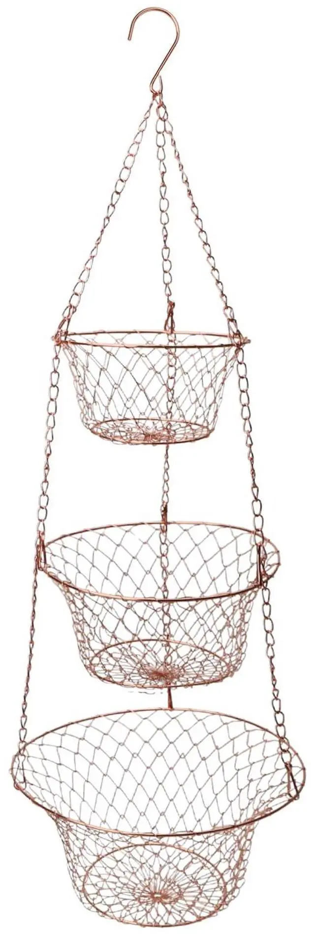 Crafted from durable, heavy-duty iron wire with a beautiful rust-resistant copper finish, it is built to last. The three baskets—measuring 7", 9", and 11" in diameter—offer ample storage space and hang from adjustable chains, allowing you to customize spacing between tiers for added flexibility.