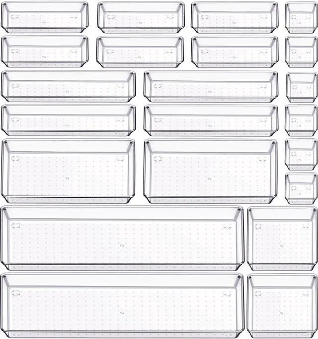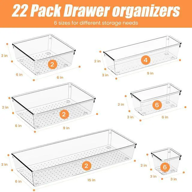 Size: 22 set of clear plastic drawer storage organizer, 15x6x2 inch (2 Pack), 9x6x2 inch (2 Pack), 6x6x2 inch (2 Pack), 9x3x2 inch (4 Pack), 6x3x2 inch (6 Pack), 3x3x2 inch (6 Pack) drawer organizers.