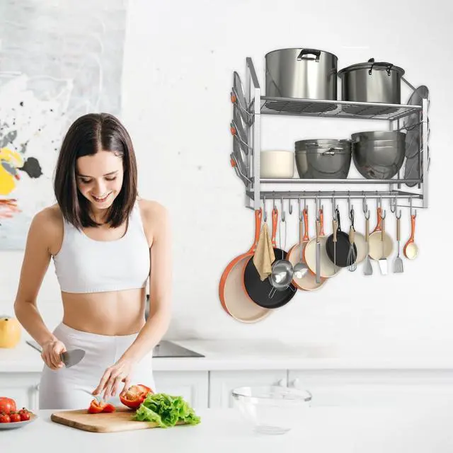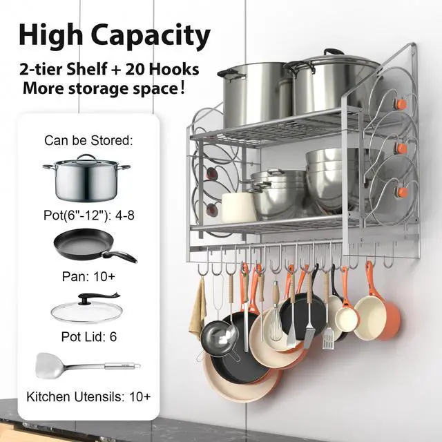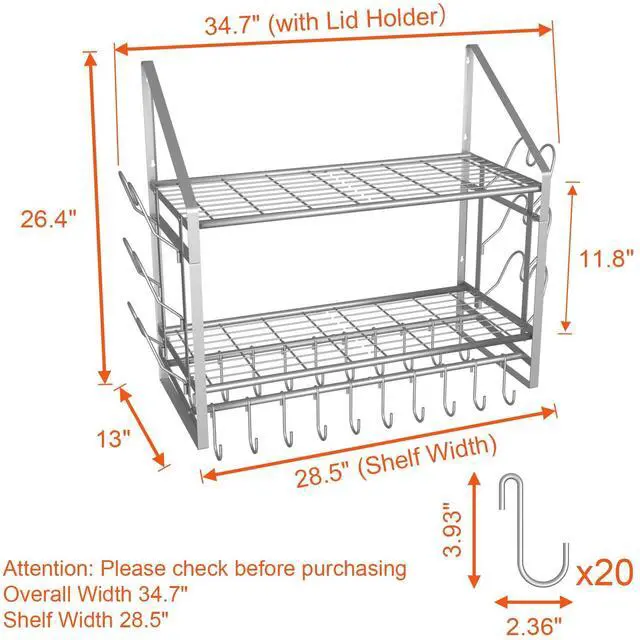 VyGrow Pot Rack Wall Mounted, Pots and Pans Organizer with 12 Hooks and 2 Pot Lid Holders, Heavy Duty Steel Pot and Pan Hanger for Kitchen Cookware Utensils Storage 34.7" Lx13" Wx12.6" H