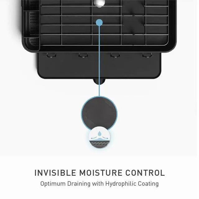 The inner plastic tray is designed for optimum draining with a hydrophilic coating that spreads water thinly across the surface for super-fast evaporation plus a central stainless steel drain that takes care of the rest — and it unscrews for easy cleaning!