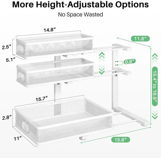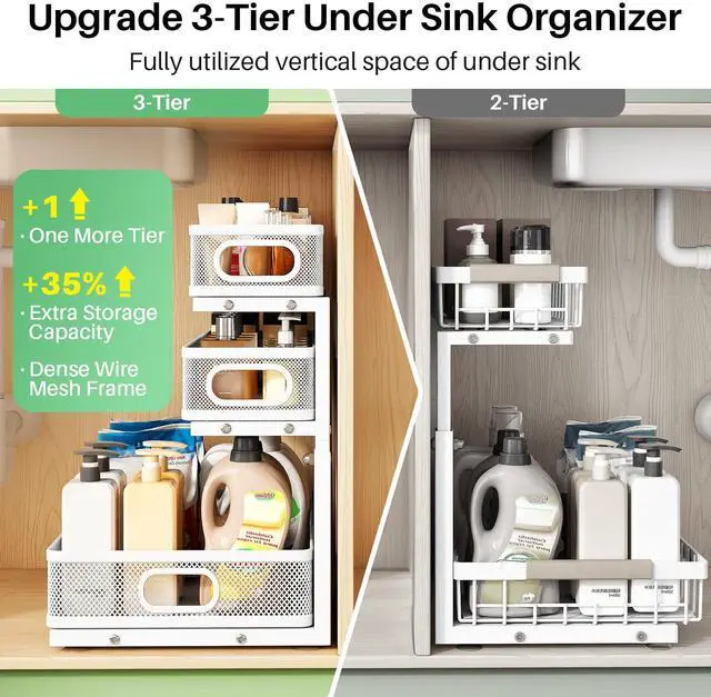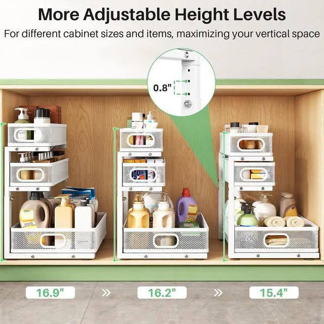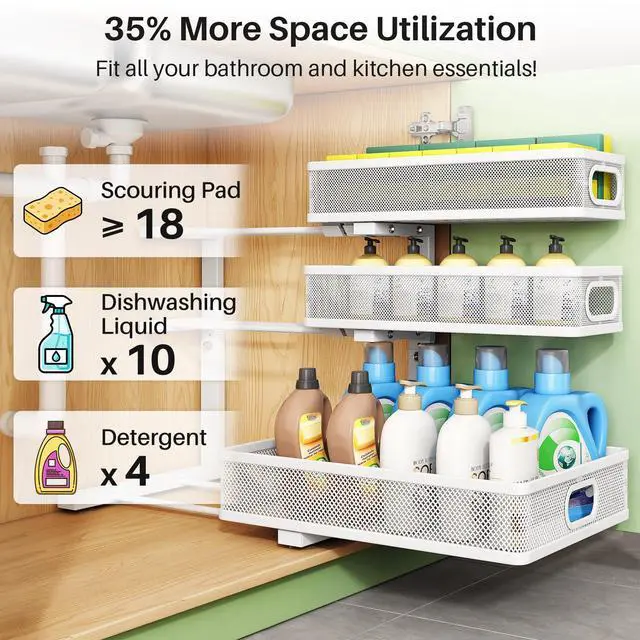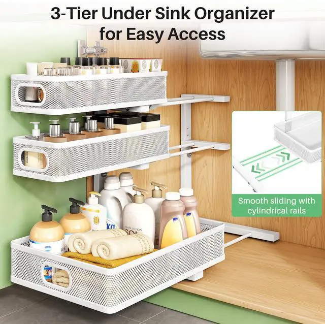 The 3 Tier under sink organizer with a unique design of 3 sliding drawer and round slide rails, comes with 4 suction cups and nano films, which make it more stable than others, is ideal for various storage scenarios and fits for your diferent size of caibinet. Helping you keep your items neatly organized under sink.