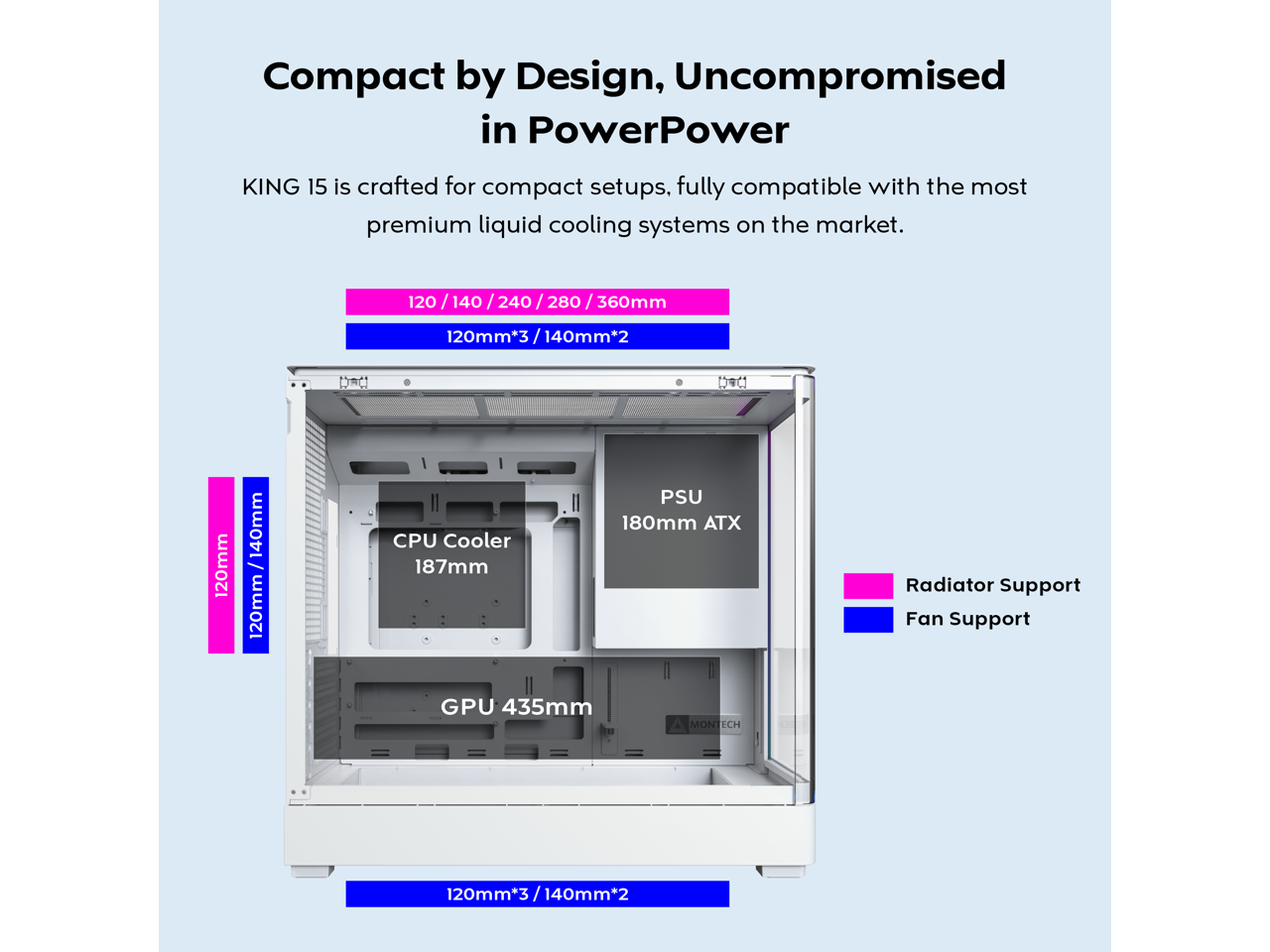 The Montech King 15 is a sleek Micro ATX case designed for efficient airflow and easy installation. Featuring a tempered glass side panel and optimized interior layout, it supports a variety of cooling solutions, including multiple fan and radiator configurations. Perfect for gamers and PC enthusiasts seeking a compact yet versatile case for their builds.