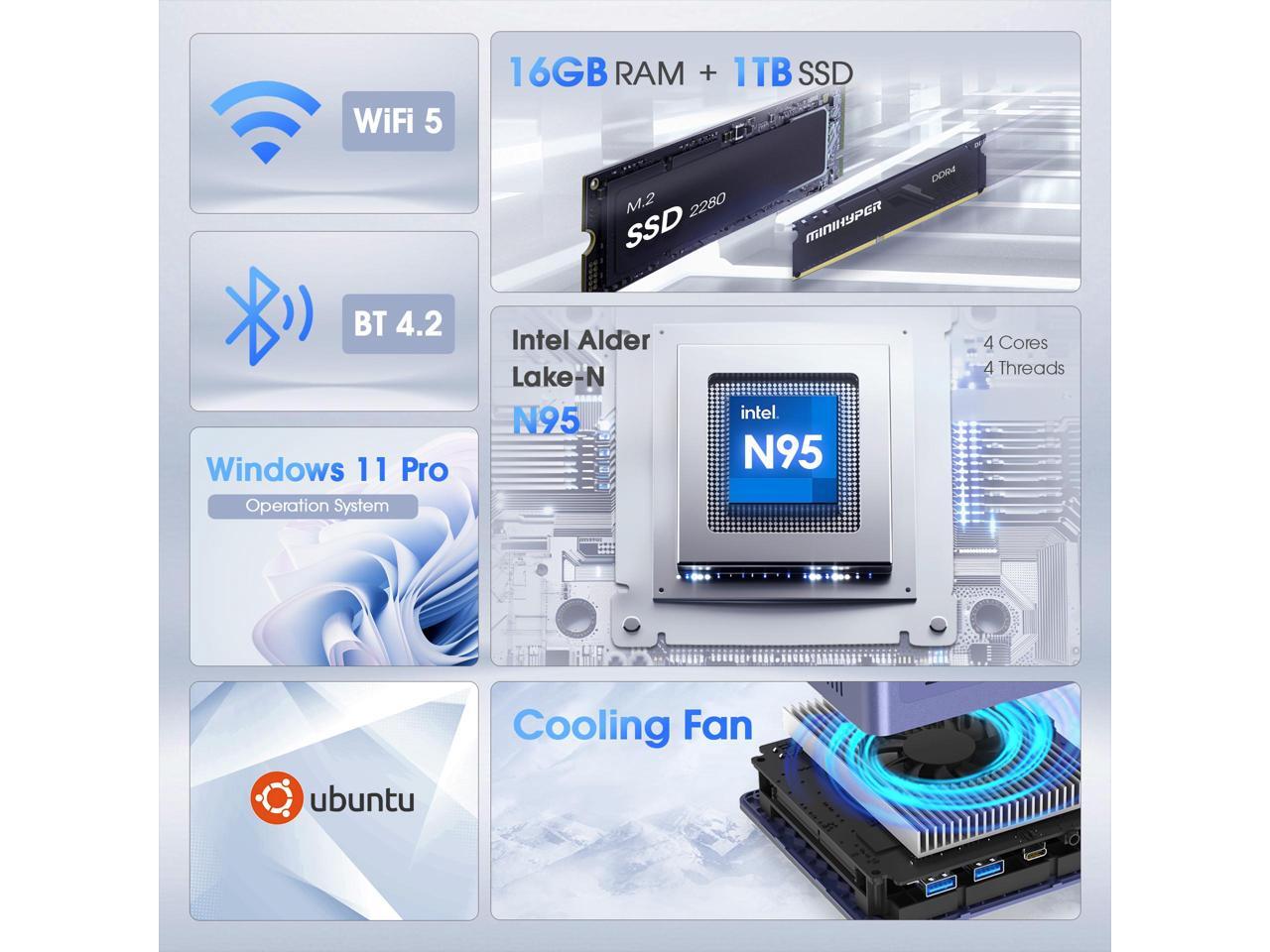 - High-performance CPU: With the Intel ADL-N N95 processor, this mini-PC offers a 4M Cache and speeds up to 3.40 GHz, ideal for everyday tasks and demanding apps.