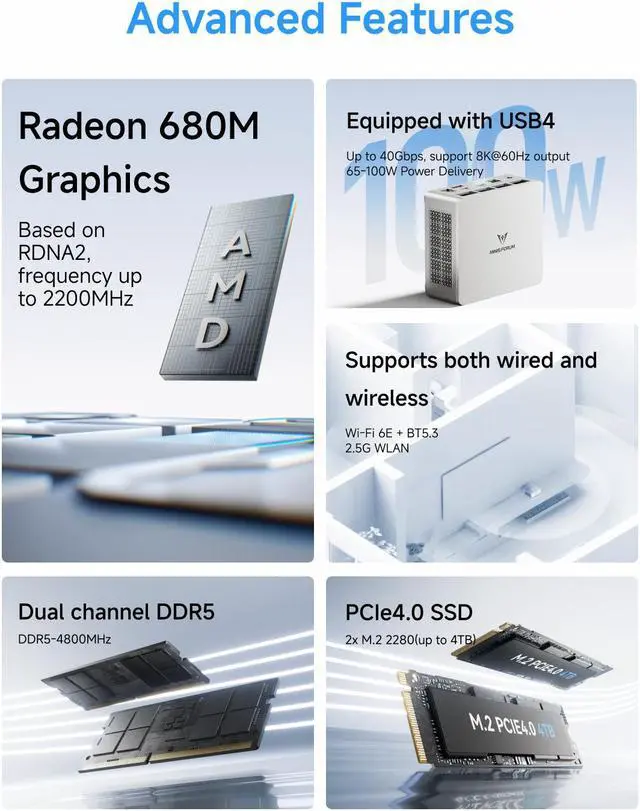 Versatile ConnectivityThis Mini PC comes with 1x HDMI 2.1 Port, 1x USB4 Port, 1x DP 1.4 Port, 2x USB 3.2 Port, 2x USB 2.0 Port, 1x 2.5G Lan Port, 1x 3.5 mm audio jack, 2x DDR5 SODIMM Slot, 1x M. 2 2280 PCIe 4.0 SSD Slot, which offers extensive connectivity options for various peripherals and external devices.