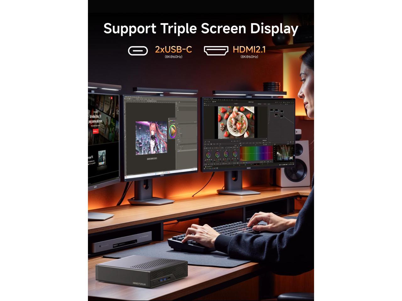 - Triple 8K Output: Enjoy stunning visuals with HDMI and two USB-C ports, all supporting 8K@60Hz. Perfect for multiple monitors, enhancing workspace efficiency for tasks like CAD and post-production.