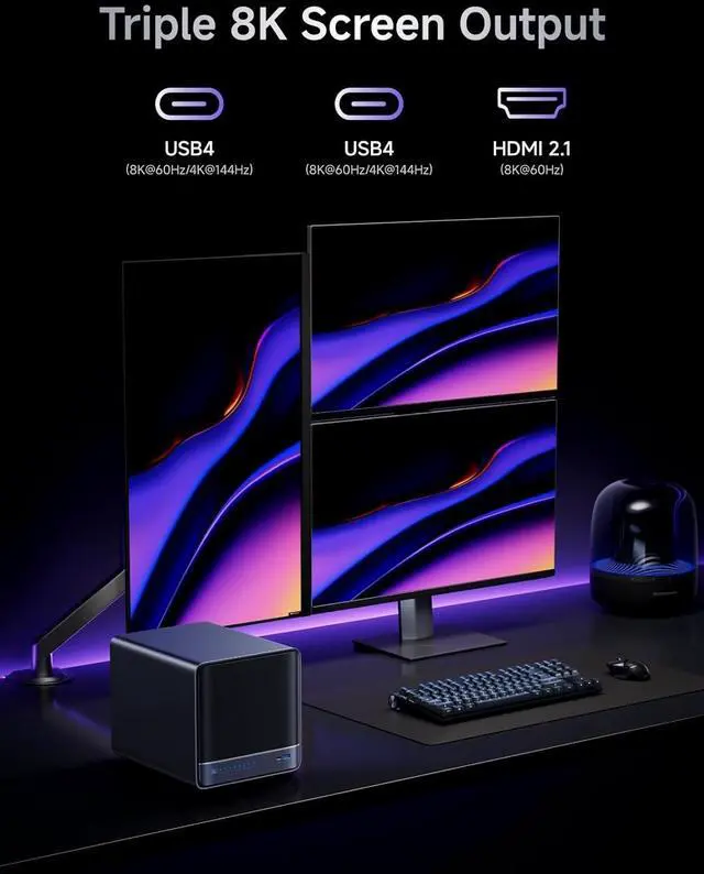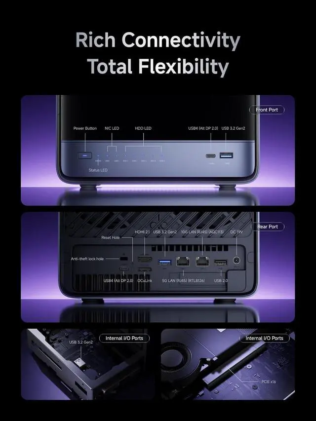 Super Speed Connectivity: Dual 10GbE+5GbE ports support link aggregation for up to 15Gbps speeds. A 1GB file transfers in under one second. PCIe 4.0 slot enables network acceleration, SSD caching, and GPU expansion. OCuLink supports an external GPU, tripling Stable Diffusion speeds.