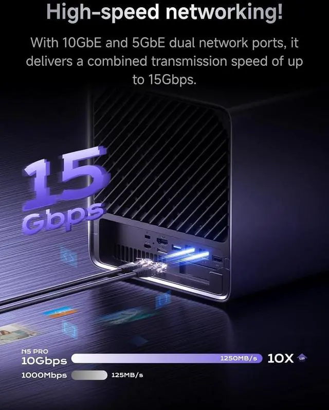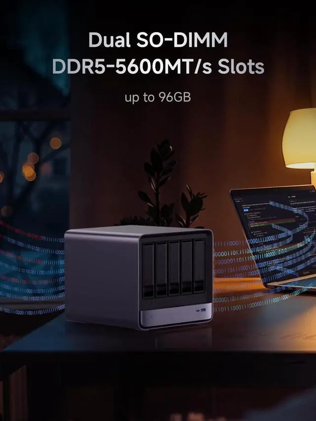 Expandable Storage: N5 Air NAS has two DDR5 SODIMM (5600MT/s) slots, expandable to 96GB. DDR5 5600 offers 75% more bandwidth than DDR4, ideal for heavy multitasking and business storage.