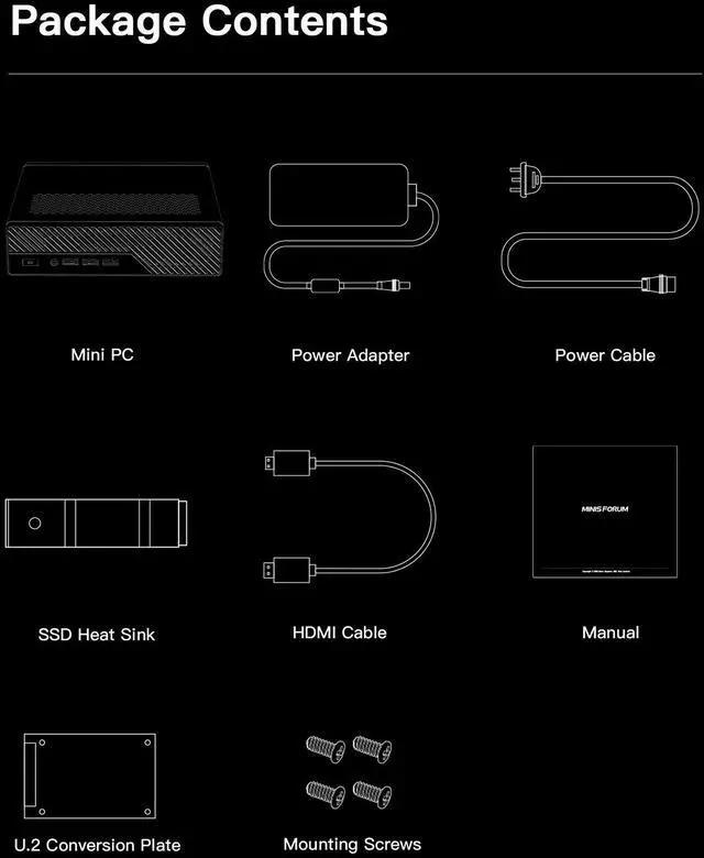 Package contents: 1xMS-01 MiniWorkStation, 1xU. 2- M. 2 Conversion Adapter, 1xPower Adapter, 1xPower Cord, 1xSSD Heat Sink, 1xHDMI Cable, 1xScrew.
