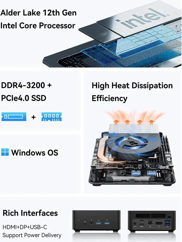 • Multiple Connections: This mini-PC offers a wide range of connectivity options, including USB ports, HDMI, and DisplayPort, providing flexibility for various peripherals and external devices.