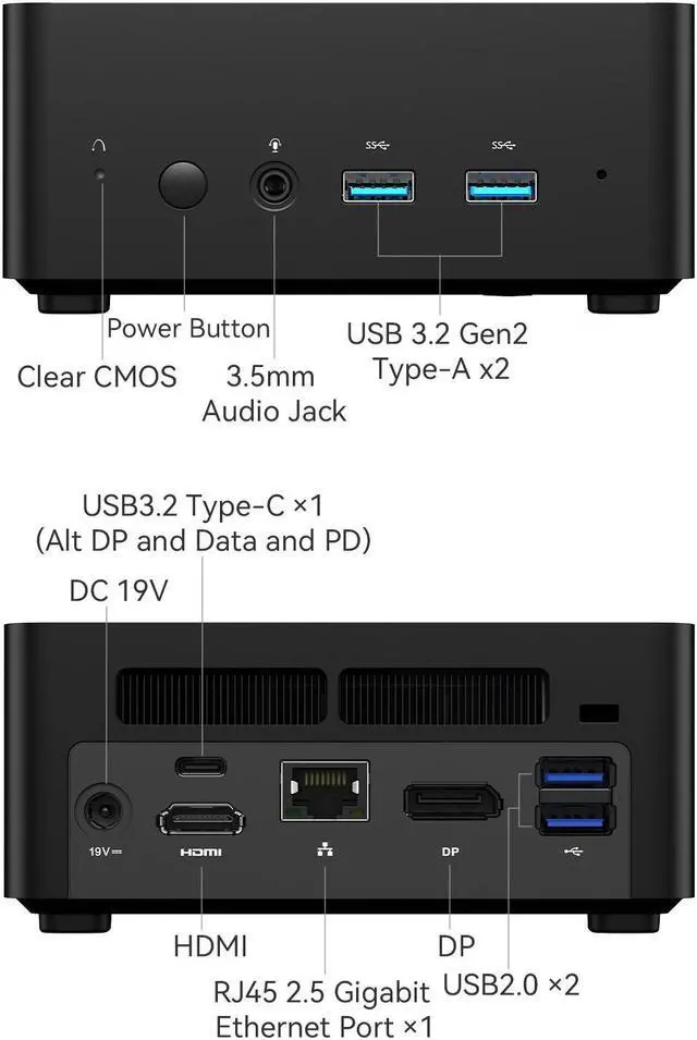 Multiple ConnectionsThis Mini Computer equipped with 1x 2.5G RJ45 Port, 1x HDMI, 1x USB 3.2 Type-C, 1x DisplayPort, 2xUSB 3.2, 2xUSB 2.0, 1x Audio Jack, 1x DMIC Port. The small pc supports Auto Power On, Wake On LAN, PXE Boot, RTC Wake etc, which is ideal to use as a server.