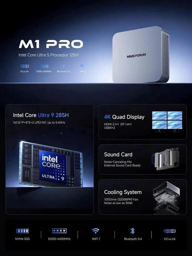 Powerful PerformanceThe AI M1 Pro Mini PC is equipped with the powerful Intel Core Ultra 9 Processor 285H(16 Cores, 16 Threads/ up to 5.4GHz), featuring the built-in Intel Arc Graphics(Graphics Frequency up to 2.35GHz) to enhance the user experience with graphics acceleration and ray tracing hardware. Boasting a remarable 2x iGPU performance compared to the previous generation. It is designed for next-generation efficient high-performance gaming and widely used in games, 3D rendering, video editing and teleworking.