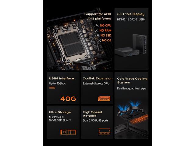 - Barebone Version for Enjoying DIY: It Comes without CPU, GPU, RAM, SSD and OS, you could install them you like and enjoy the fun of DIY. It support AMD AM5 Socket CPU.